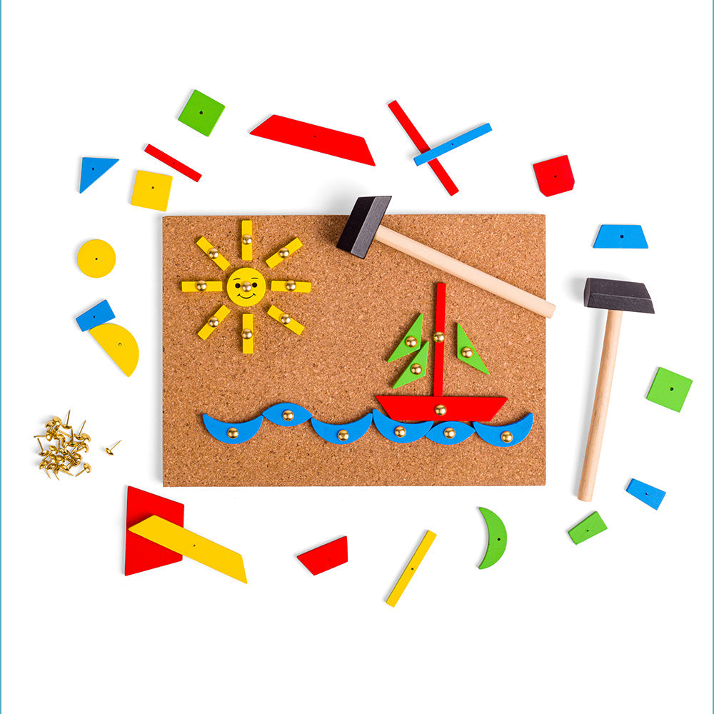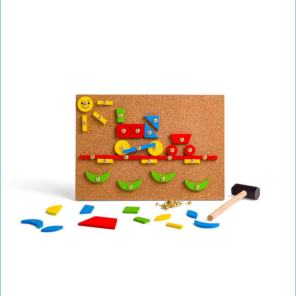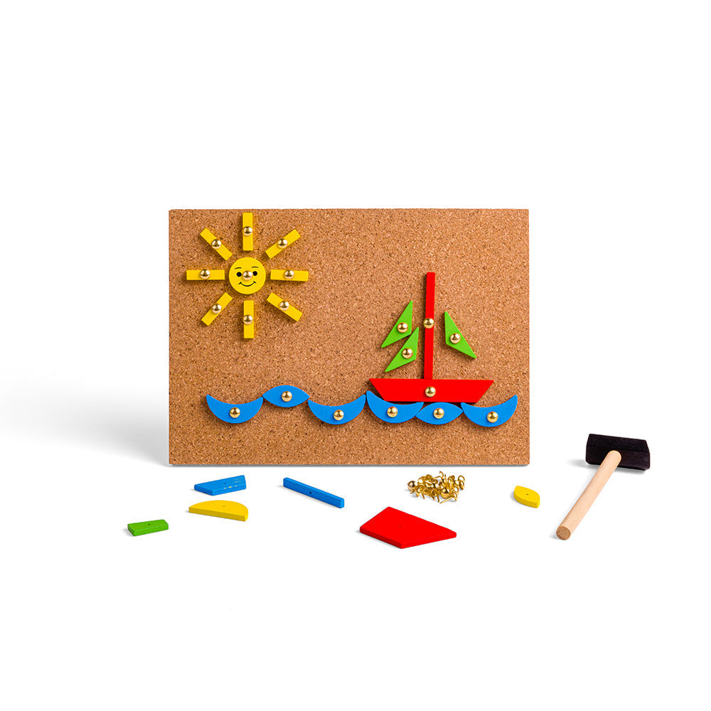 Comes with over 220 play pieces - including circles, squares, triangles, moons, half-circles & more. Complete with a hammer and a bag of pins, use the hammer to tape the shapes into the corkboard. If you need to expand your pin collection, you can top it up with our additional 100 pins.